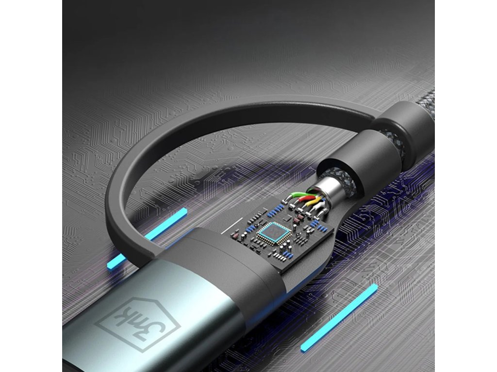 Kábel kombinuje flexibilitu nylonu s odolnosťou konektorov z hliníkovej zliatiny, výsledkom je odolný produkt, pohodlný na použitie a schopný odolať opakovanému ohybaniu.