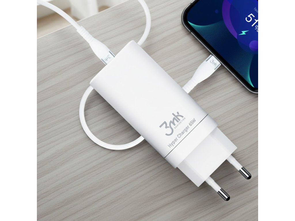 3mk - Wall Charger Hyper sieťová nabíjačka (2× USB-C, 1× USB-A, GaN technológia, Quick Charge, 65W) - biela