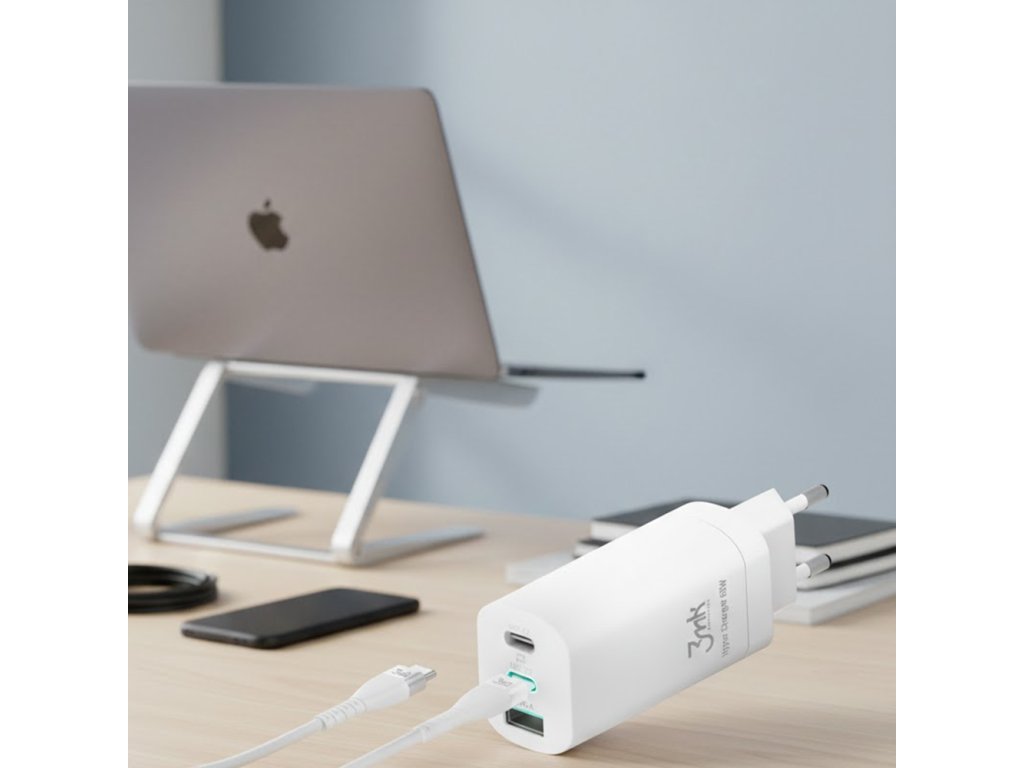 Nabíjačka do zásuvky 3mk ponúka výkon 65W s QC3.0 a Power Delivery, zabezpečujúc rýchle a stabilné nabíjanie pre smartfón, laptop alebo tablet.