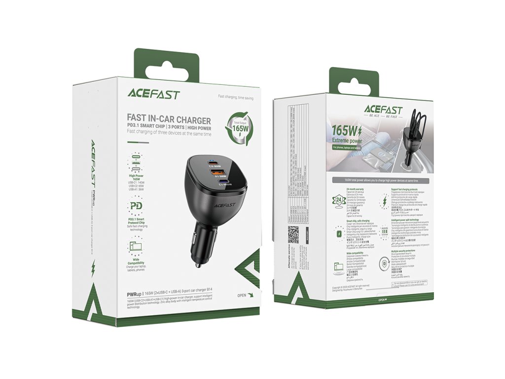 Acefast – Car Charger (B14) autonabíjačka 2× USB-C + USB 165W rýchle nabíjanie s inteligentnou reguláciou teploty – čierna