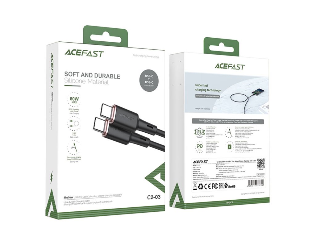 Acefast - Data Cable dátový a nabíjací kábel USB-C na USB-C Fast Charge 60 W (3 A), 1,2 m – čierny