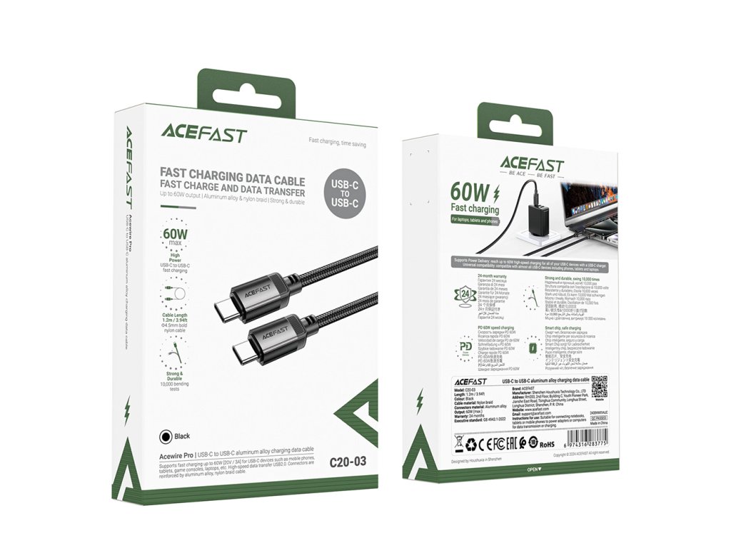 Acefast - Data Cable dátový a nabíjací kábel USB-C na USB-C Fast Charge 60 W (3 A), nylonové opletenie, 1,2 m – čierny