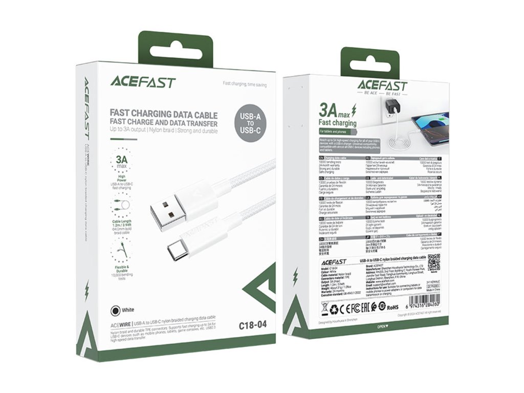 Acefast - Data Cable dátový a nabíjací kábel USB na USB-C Fast Charge 3 A, nylonové opletenie, 1,2 m – biely