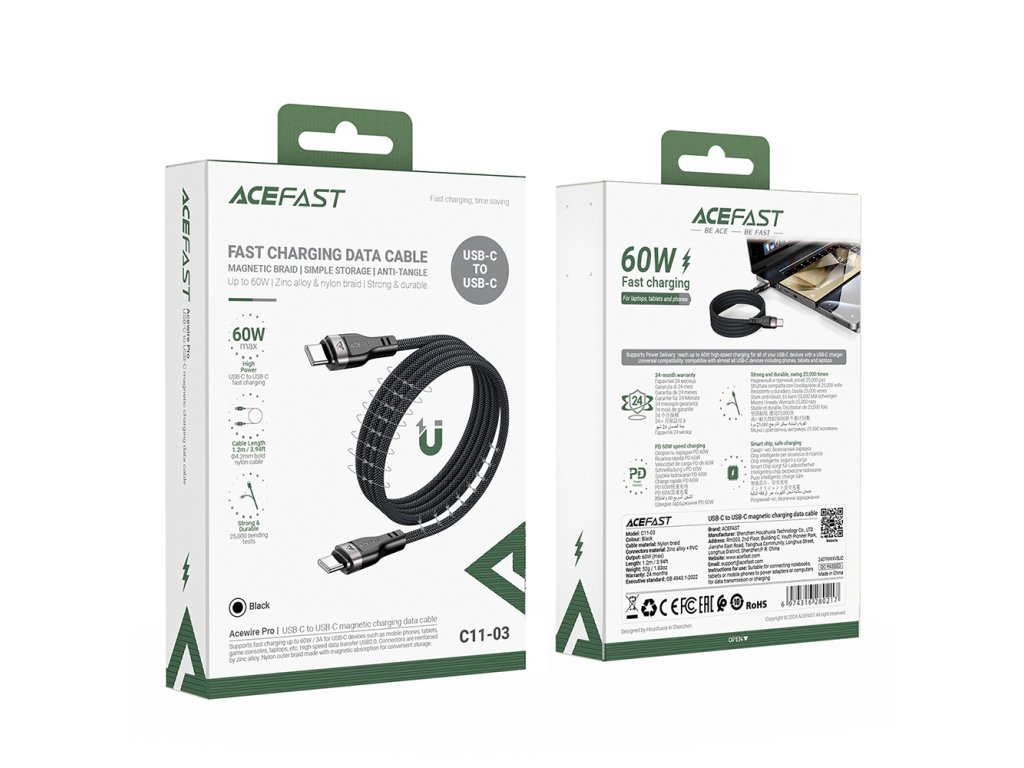Acefast - Data Cable magnetický dátový a nabíjací kábel USB-C na USB-C Fast Charge 60 W (3 A), nastaviteľná dĺžka, 1,2 m – čierny
