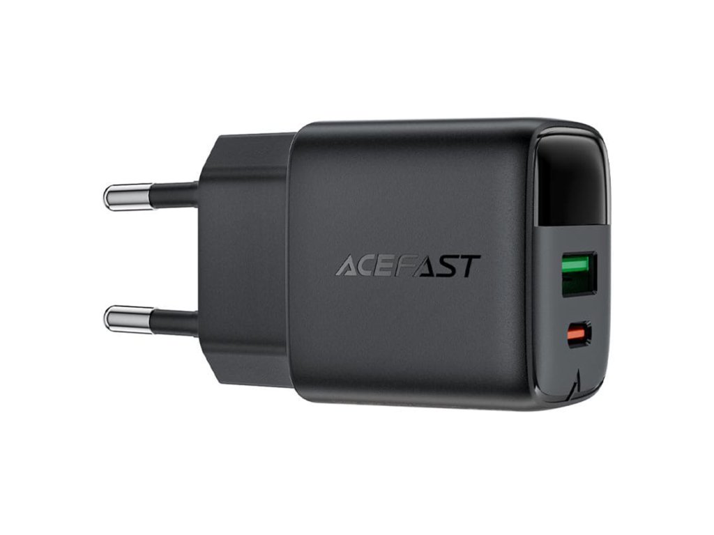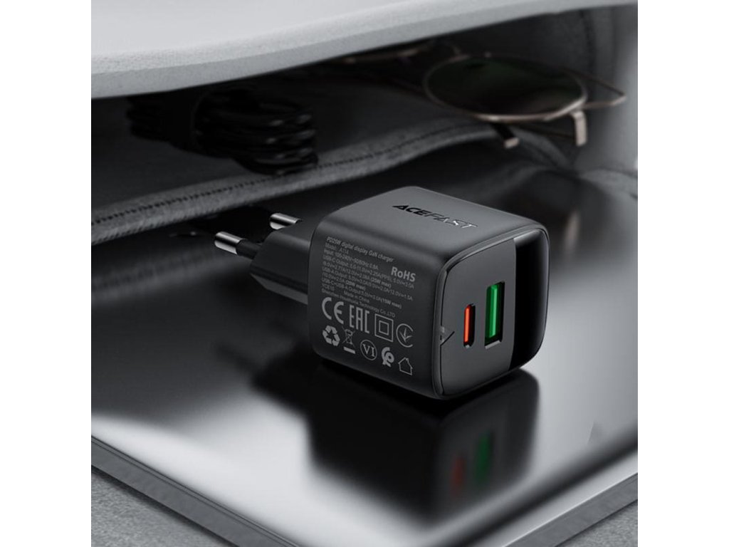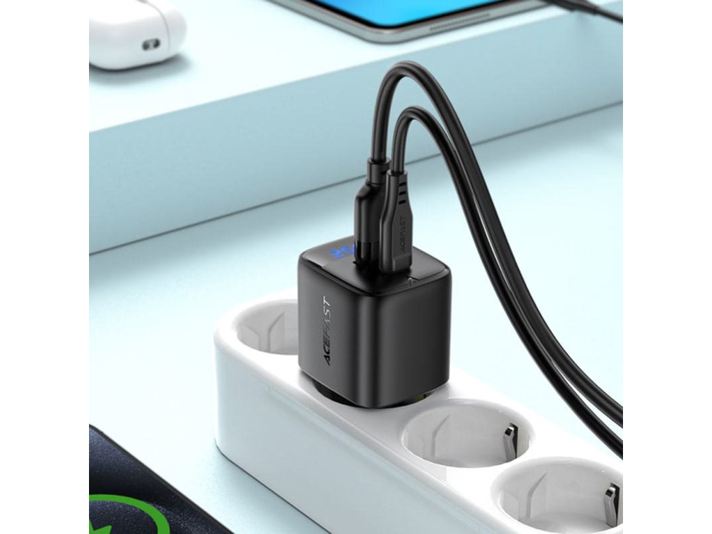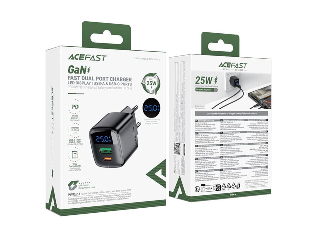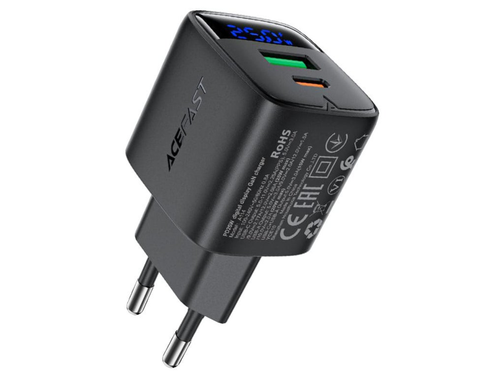 Acefast - Wall Charger A114 sieťová nabíjačka (digitálny displej, rýchlonabíjanie, GaN technológia, USB + USB-C, PD25W, 5V/3A) - čierna