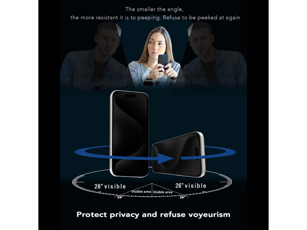 Fólia pre iPhone 15 Pro privacy je vyrobená z tvrdeného skla s tvrdosťou 9H, pochádzajúceho od svetovo uznávaných dodávateľov.