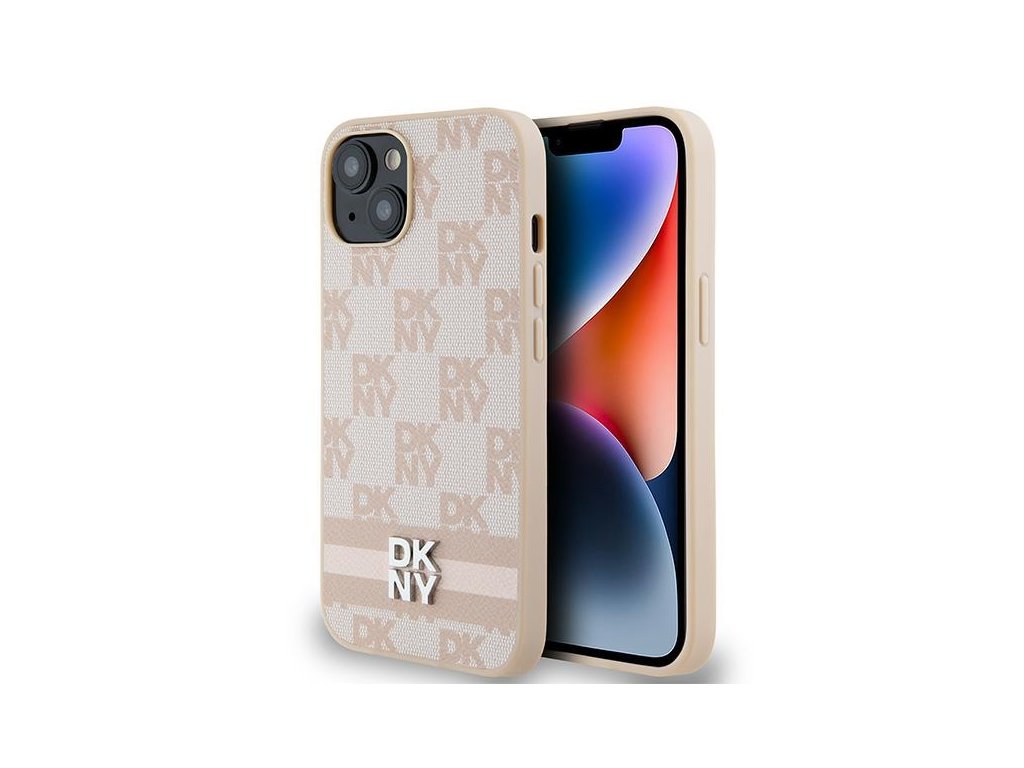 DKNY - Leather Checkered Mono Pattern & Printed Stripes (DKHCP15MPCPTSSP) - iPhone 15 Plus - Pink
