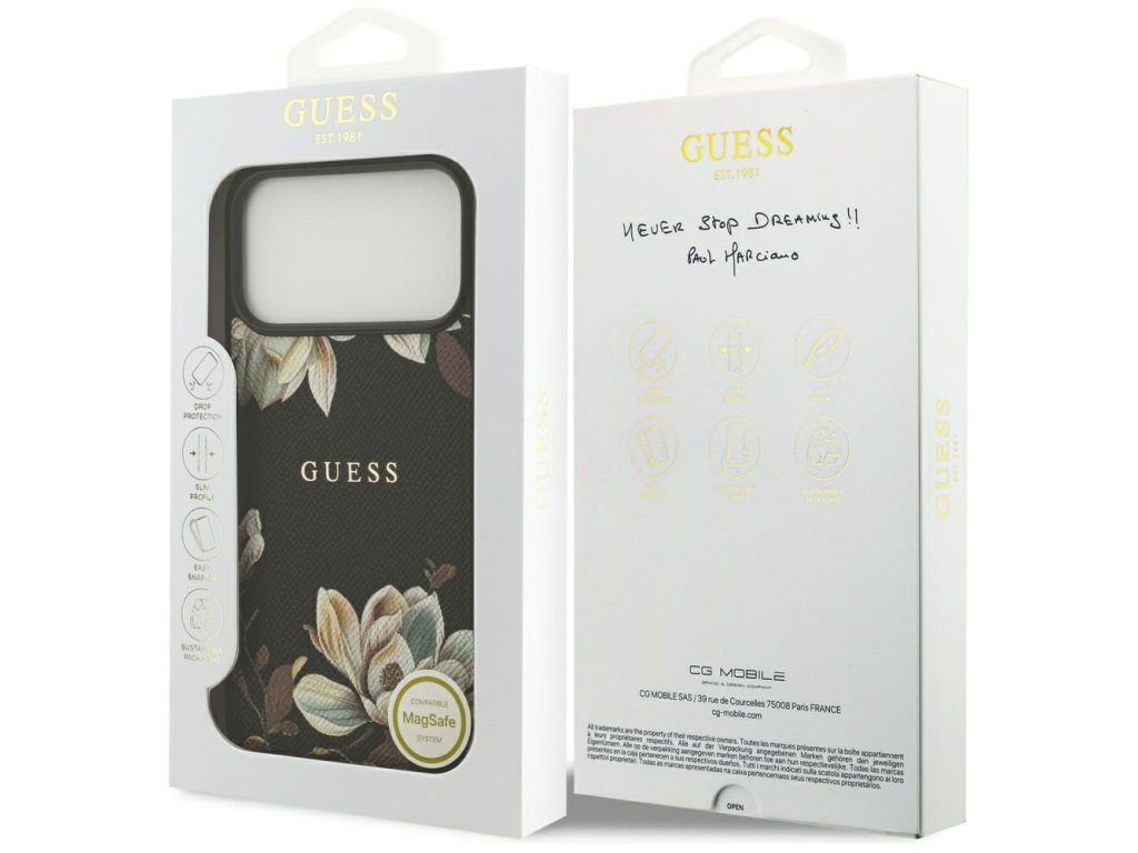 Guess – Grained Flowers MagSafe puzdro na iPhone 17 Pro Max – čierne