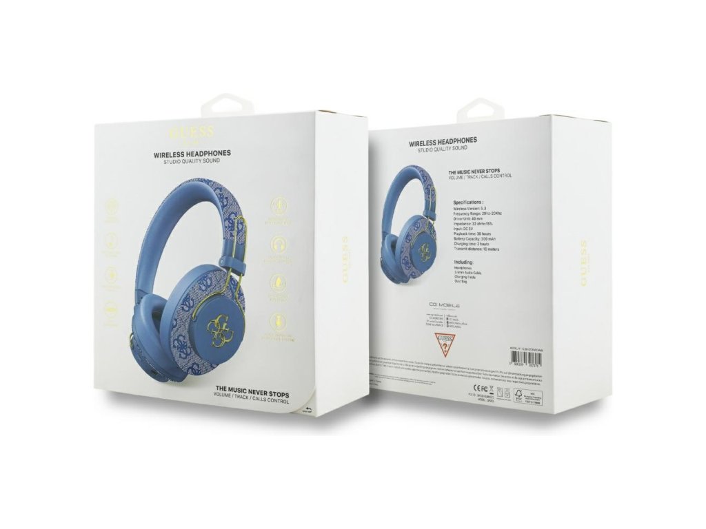 Guess - bezdrôtové slúchadlá 4G Metal Logo, Bluetooth 5.3, ENC, USB-C, eko-koža, on-ear, 300 mAh - modré