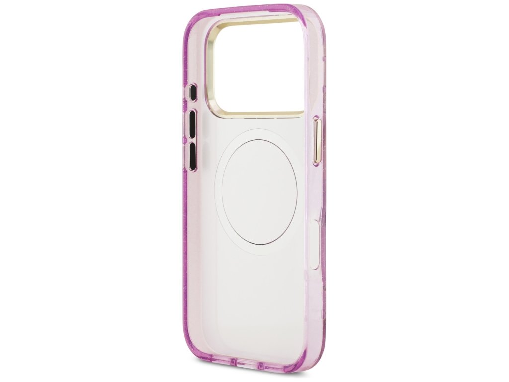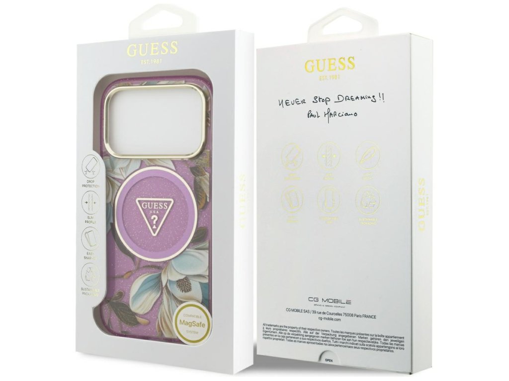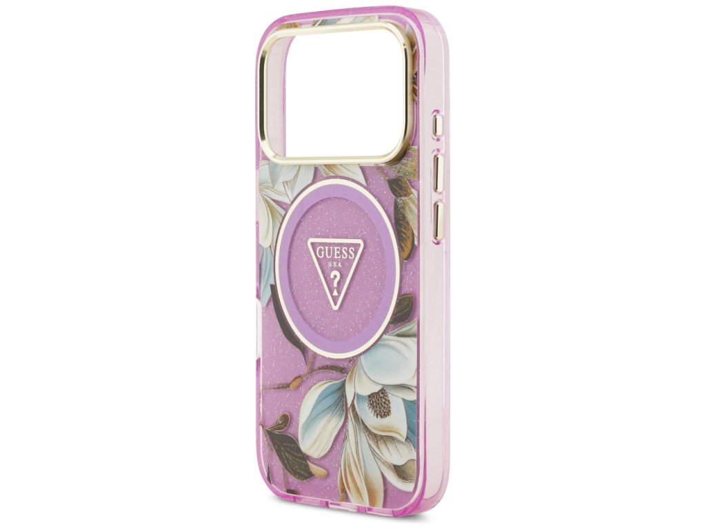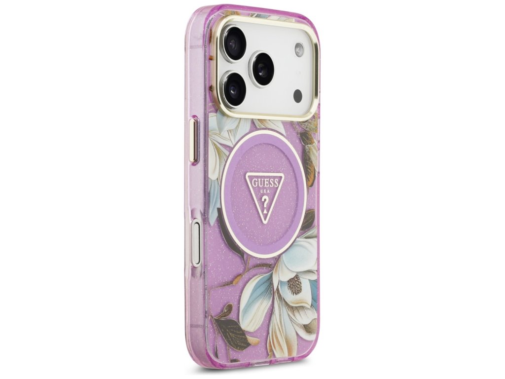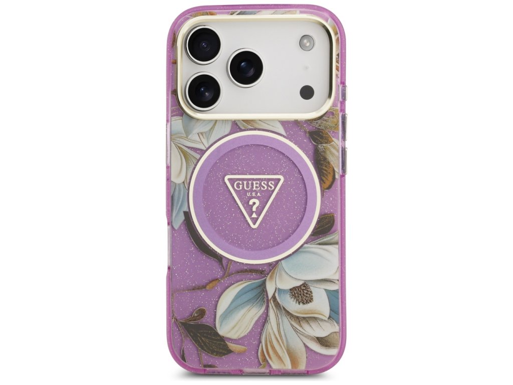 Guess - IML Glitter Flowers Triangle MagSafe puzdro pre iPhone 17 Pro Max - fialové