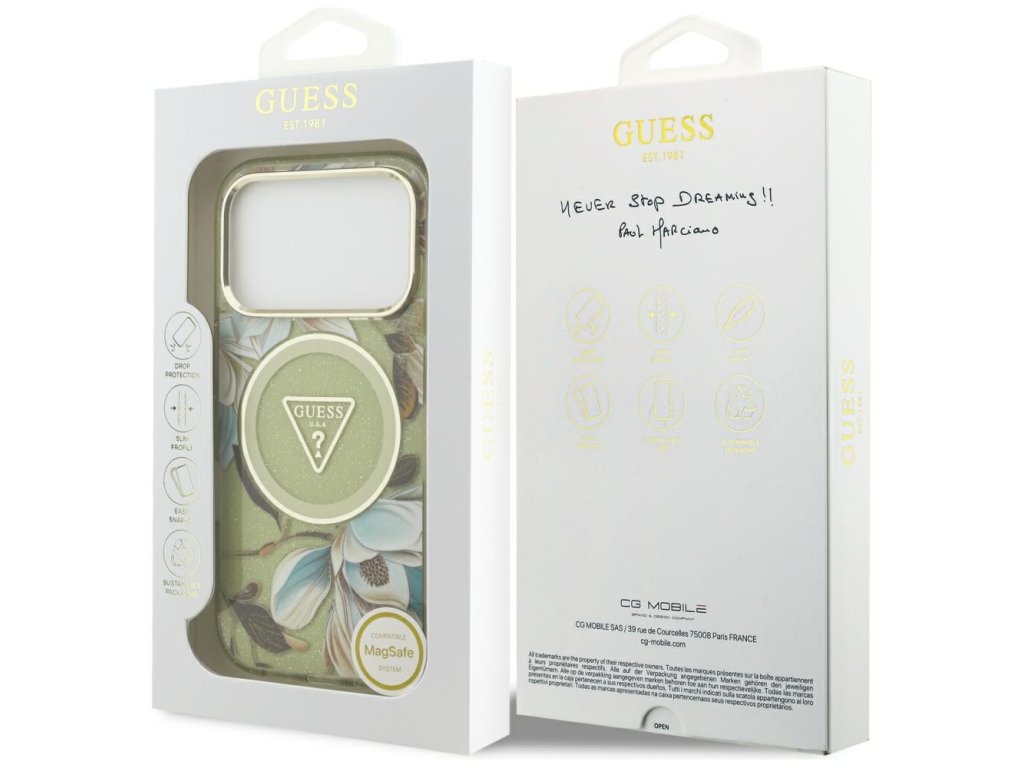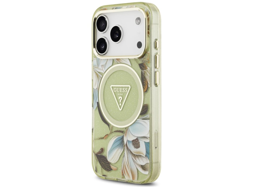 Guess - IML Metal Glitter Flowers Triangle MagSafe puzdro pre iPhone 17 Pro Max - zelené