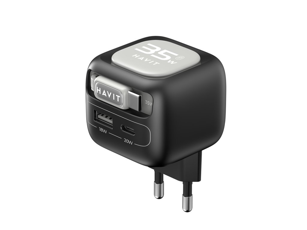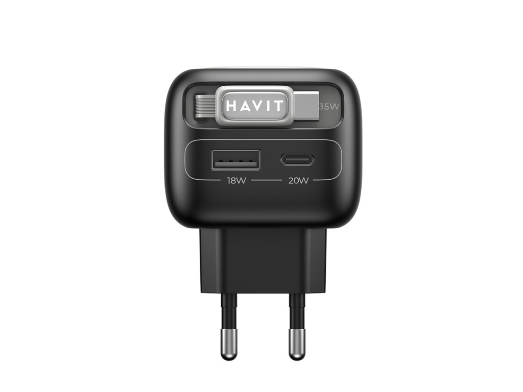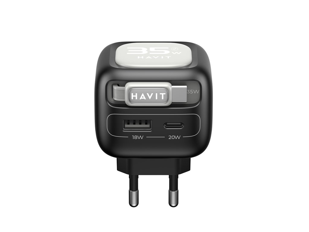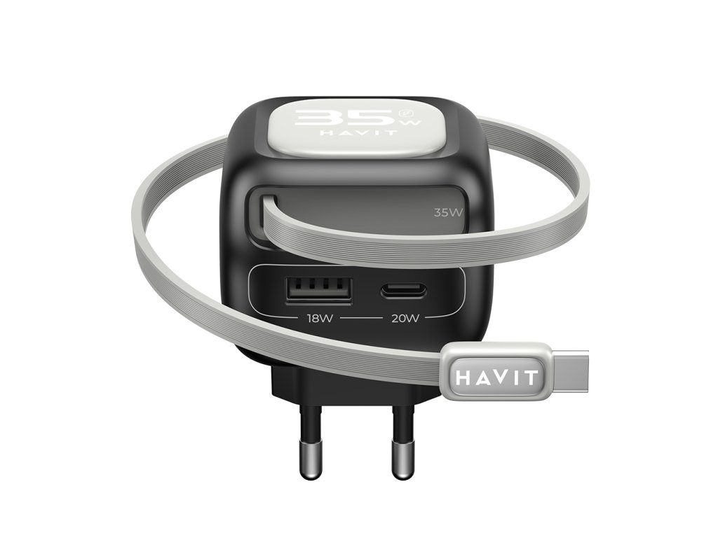 Havit - Wall Charger UC251 EU sieťová nabíjačka (USB-C výsuvný kábel, USB-C, USB, GaN technológia, 35W) - čierno-sivá