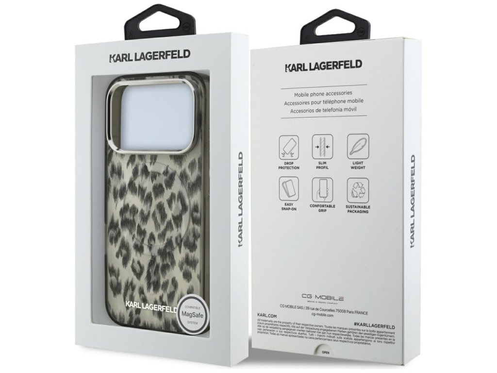 Prstenec MagSafe uľahčuje bezdrôtové nabíjanie a robí z puzdra iPhone 17 Pro Karl Lagerfeld moderný, reprezentatívny obrys našich technologických dní.