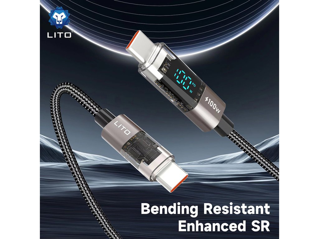 Lito - Data Cable dátový a nabíjací kábel USB-C na USB-C High Speed Charge 100 W s LED displejom, 1,2 m – čierny