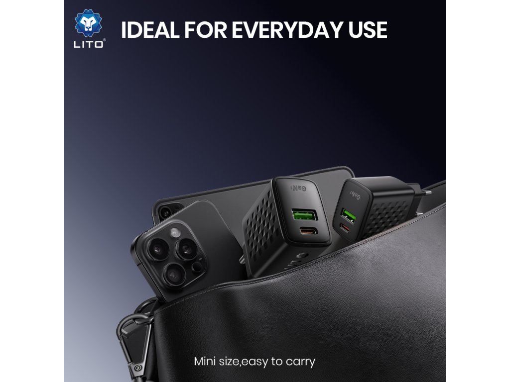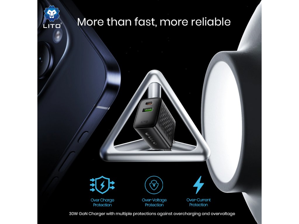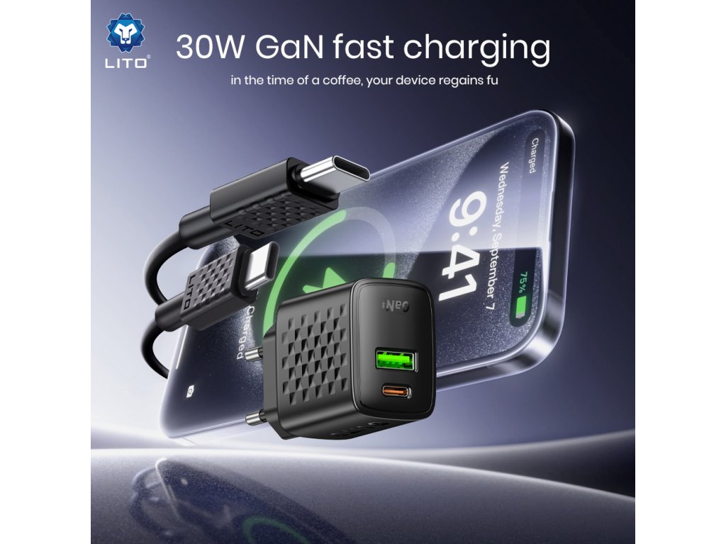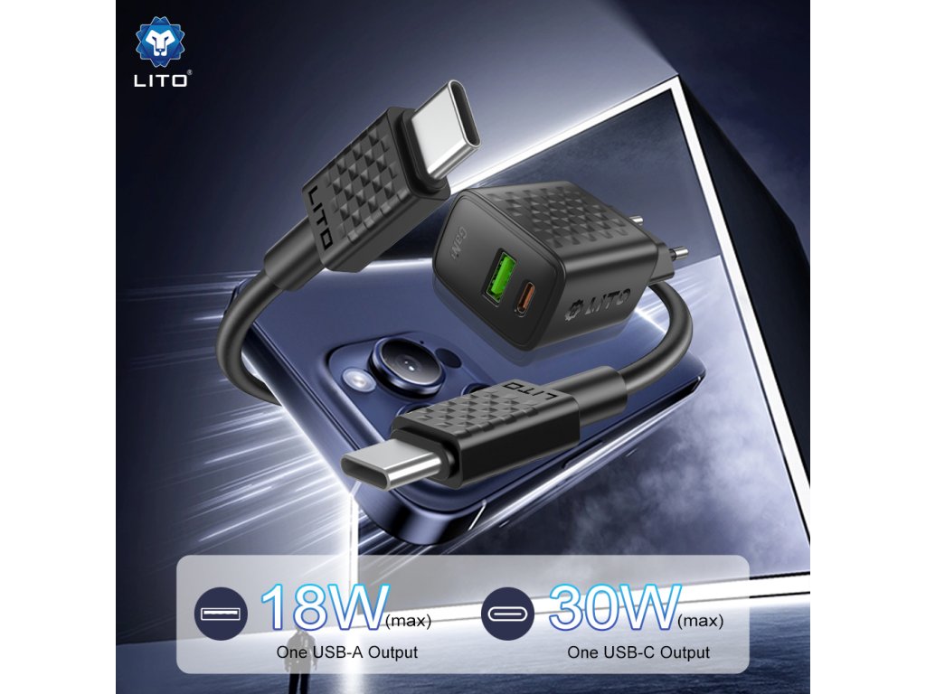 Lito - Wall Charger LC19T sieťová nabíjačka (USB-C kábel v balení, USB-C + USB, PD30W, GaN technológia, nehorľavý PC materiál, EU vidlica) - čierna