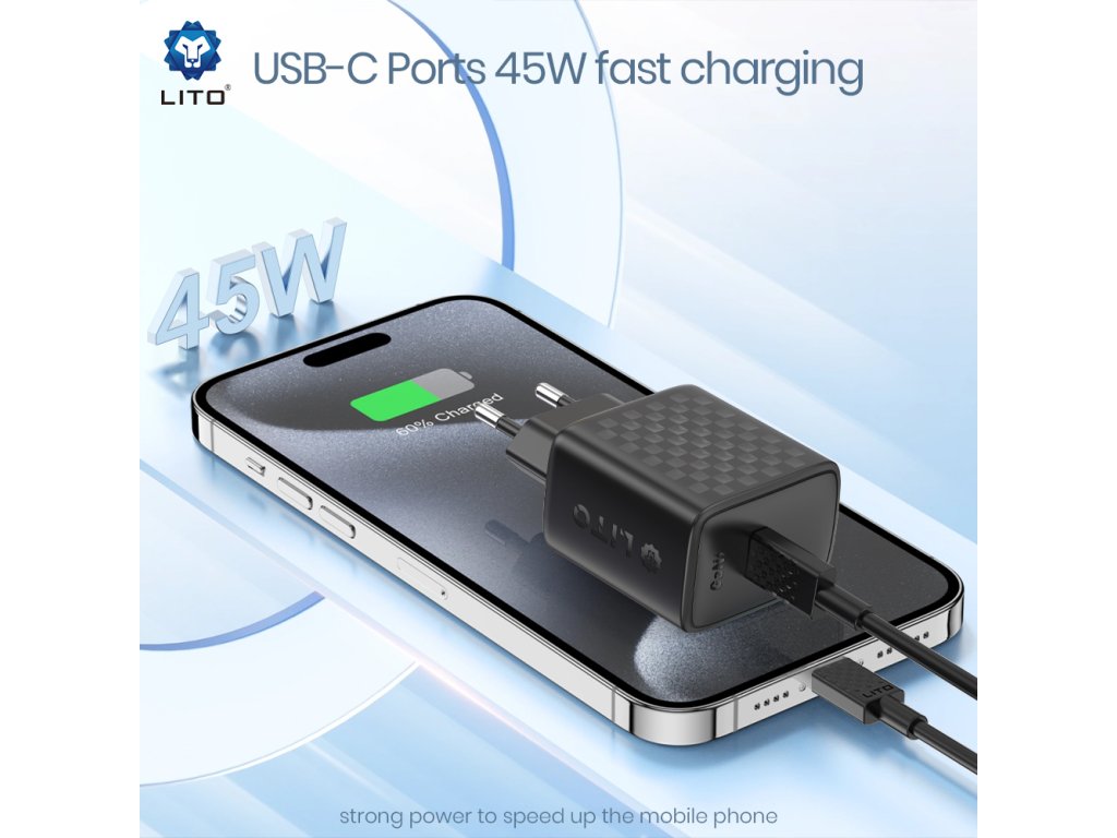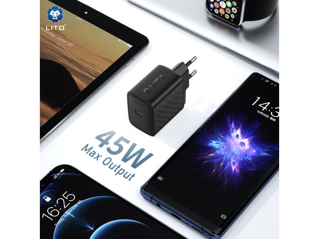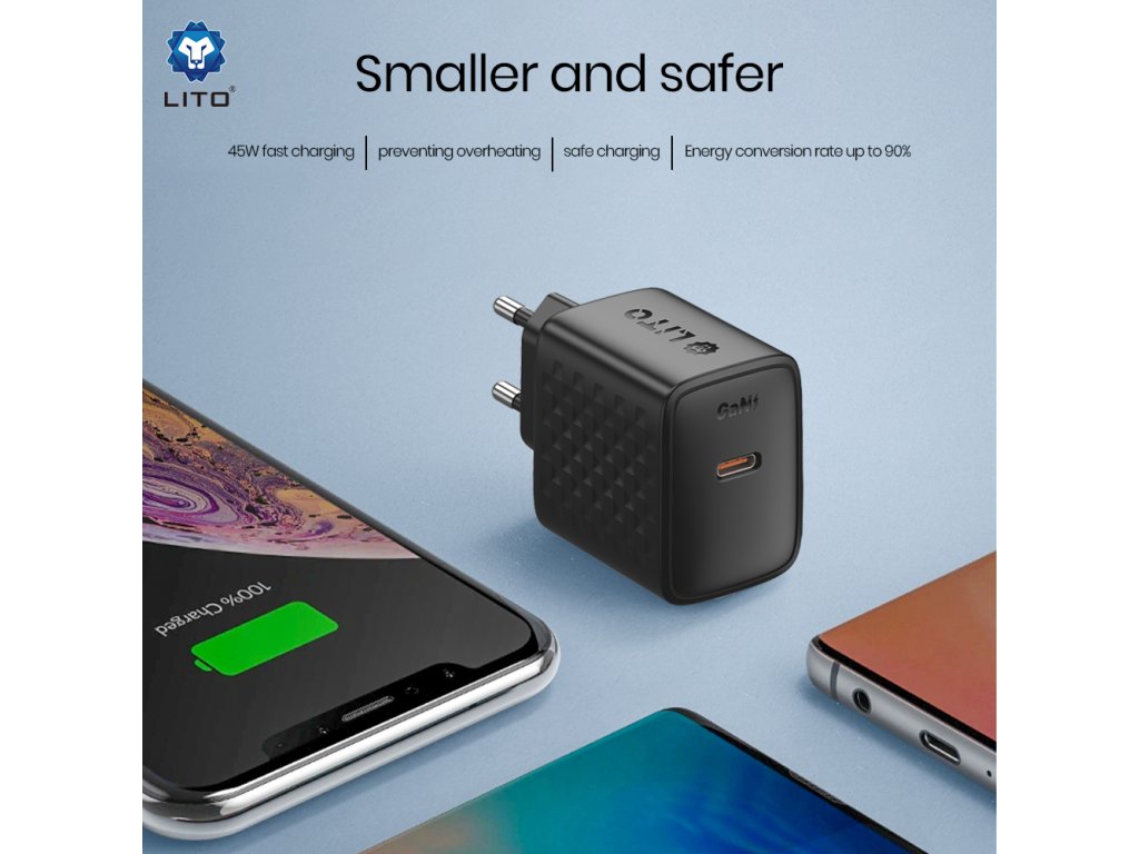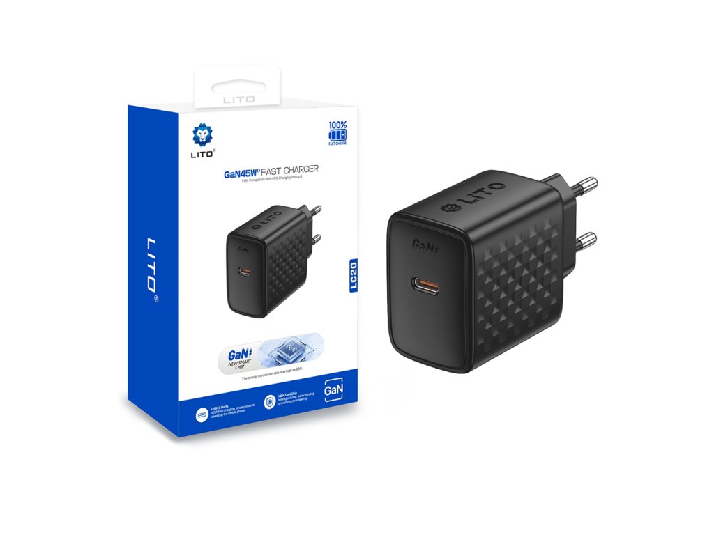 Lito - Wall Charger LC20 sieťová nabíjačka (USB-C výstup, PD45W, GaN technológia, nehorľavý PC materiál, EU vidlica) - čierna