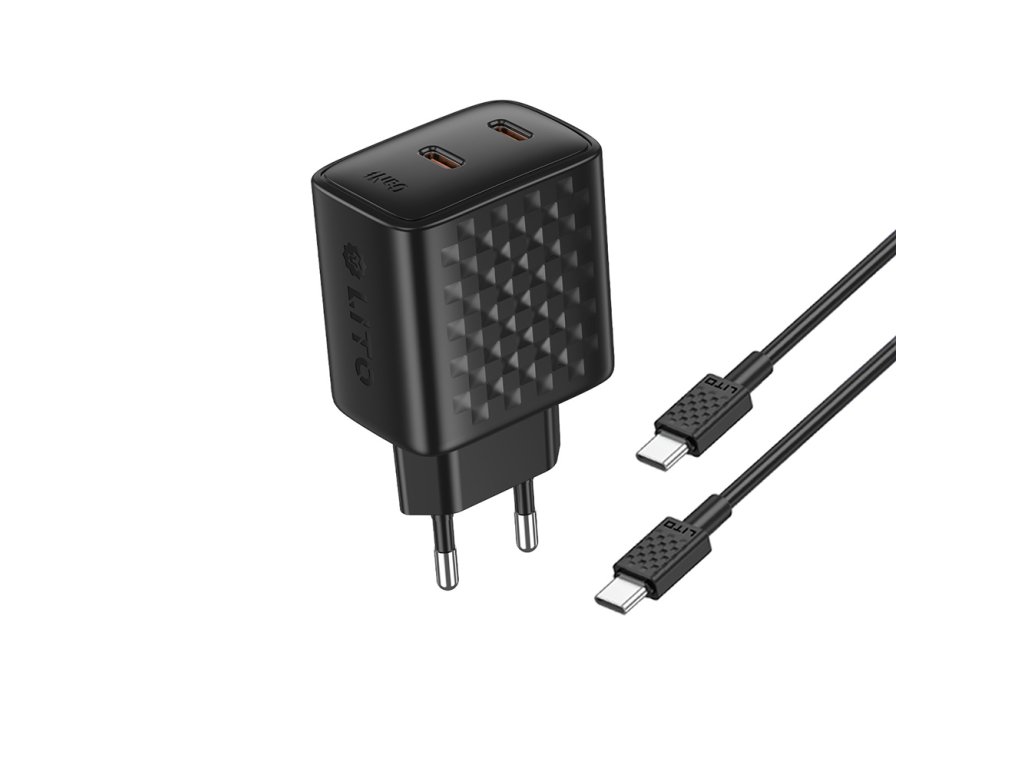Lito - Wall Charger LC22T sieťová nabíjačka (USB-C kábel v balení 1 m, 2× USB-C výstup, PD45W, GaN technológia, nehorľavý PC materiál, EU vidlica) - čierna