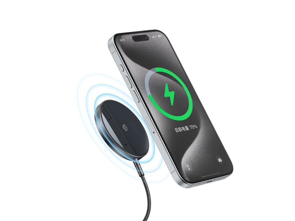 Štíhly profil a lesklý povrch transformujú tento magnetický nabíjač pre telefón na estetický prvok, ktorý harmonicky doplní váš setup.