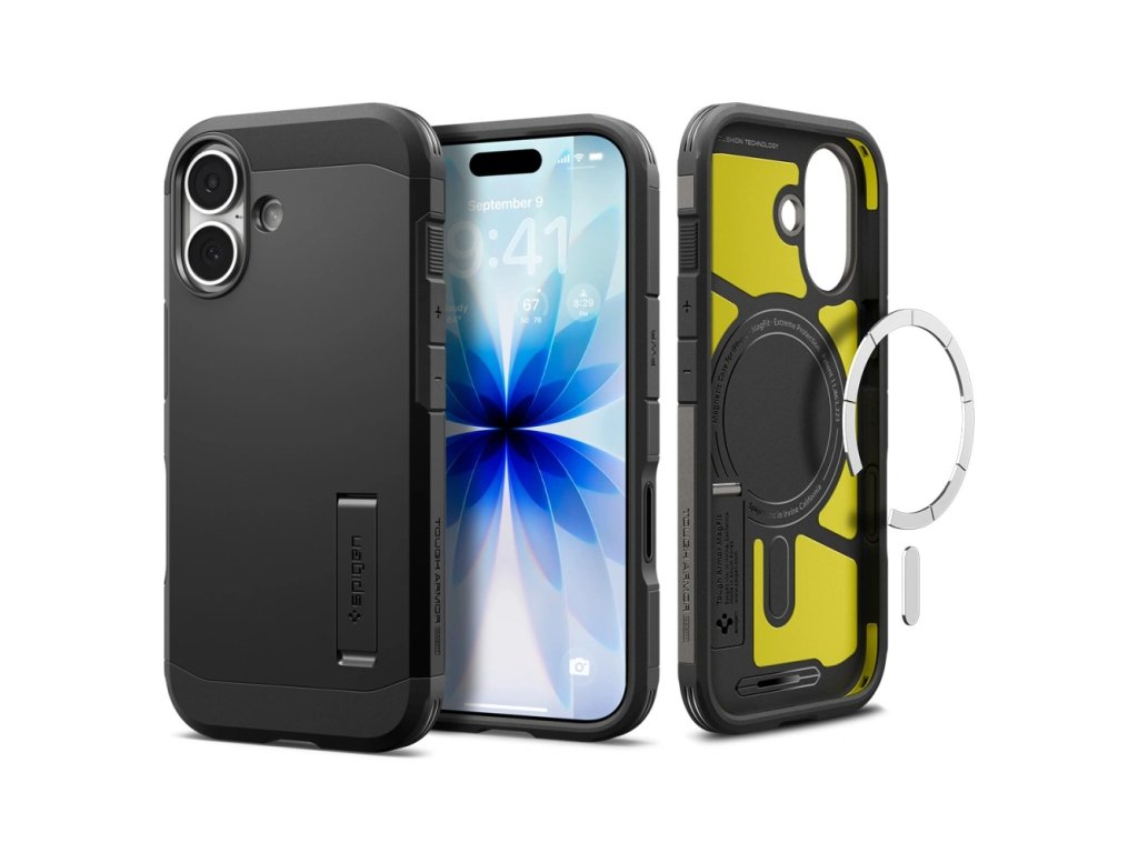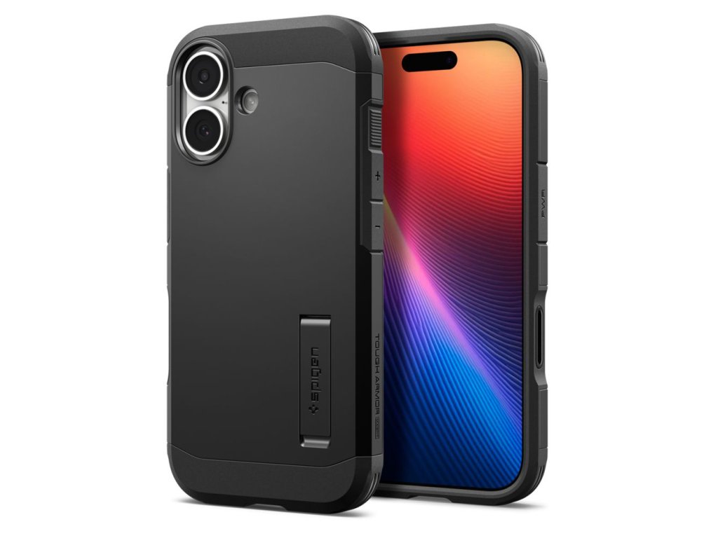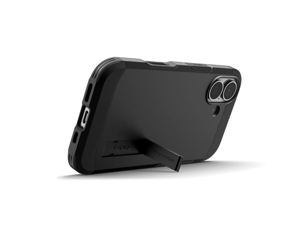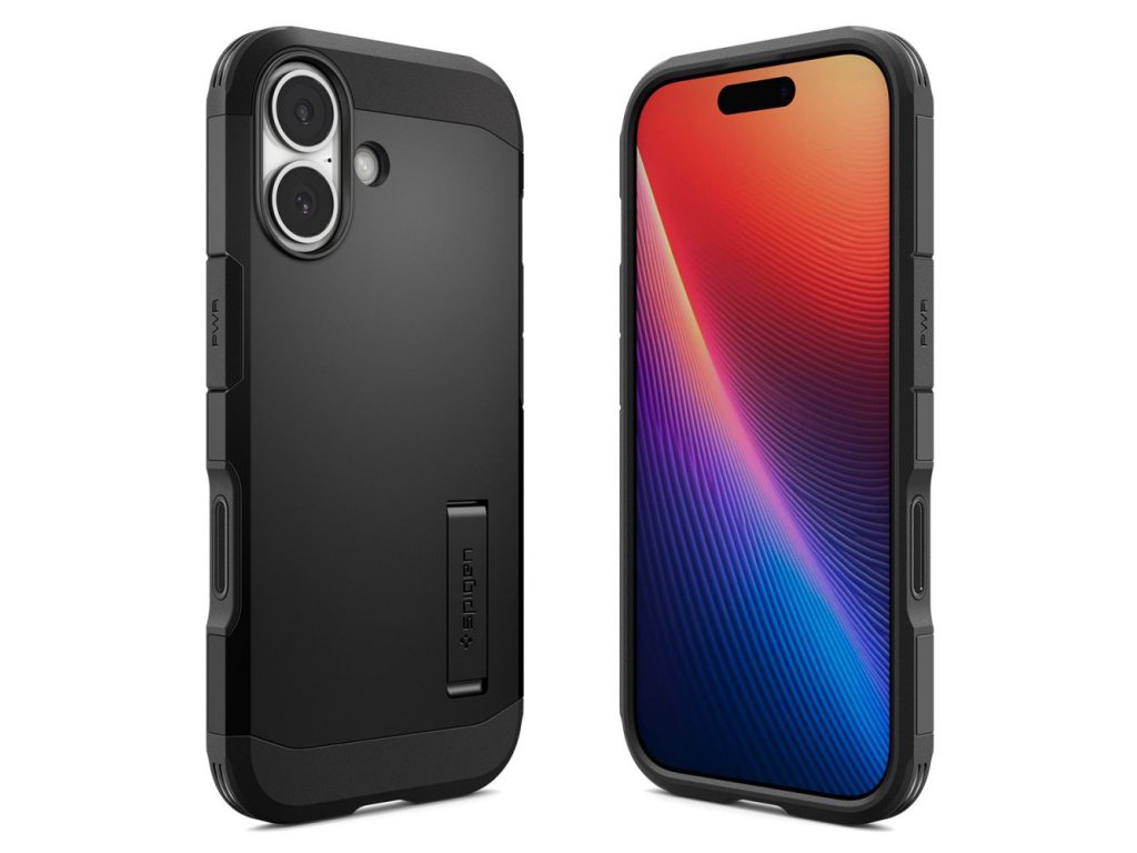 Puzdro Spigen Tough Armor pre iPhone 17, vyrobené z TPU gélu a čierneho polykarbonátu, zabraňuje náhodnému šmyknutiu a je odolné voči opotrebeniu.