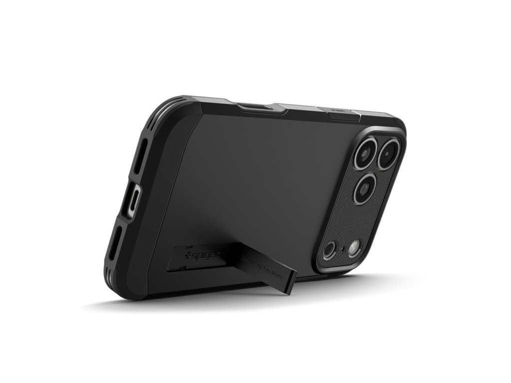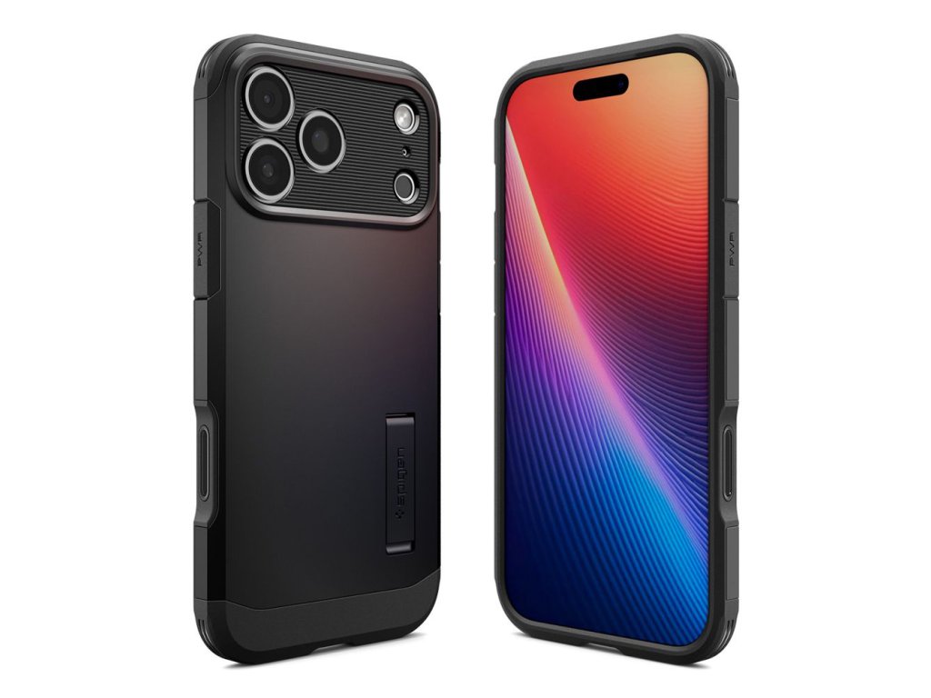 Obal Spigen Tough Armor pre iPhone 17 Pro Max, vyrobený z TPU gélu a čierneho polykarbonátu, zabraňuje náhodnému skĺznutiu a je odolný voči opotrebeniu.
