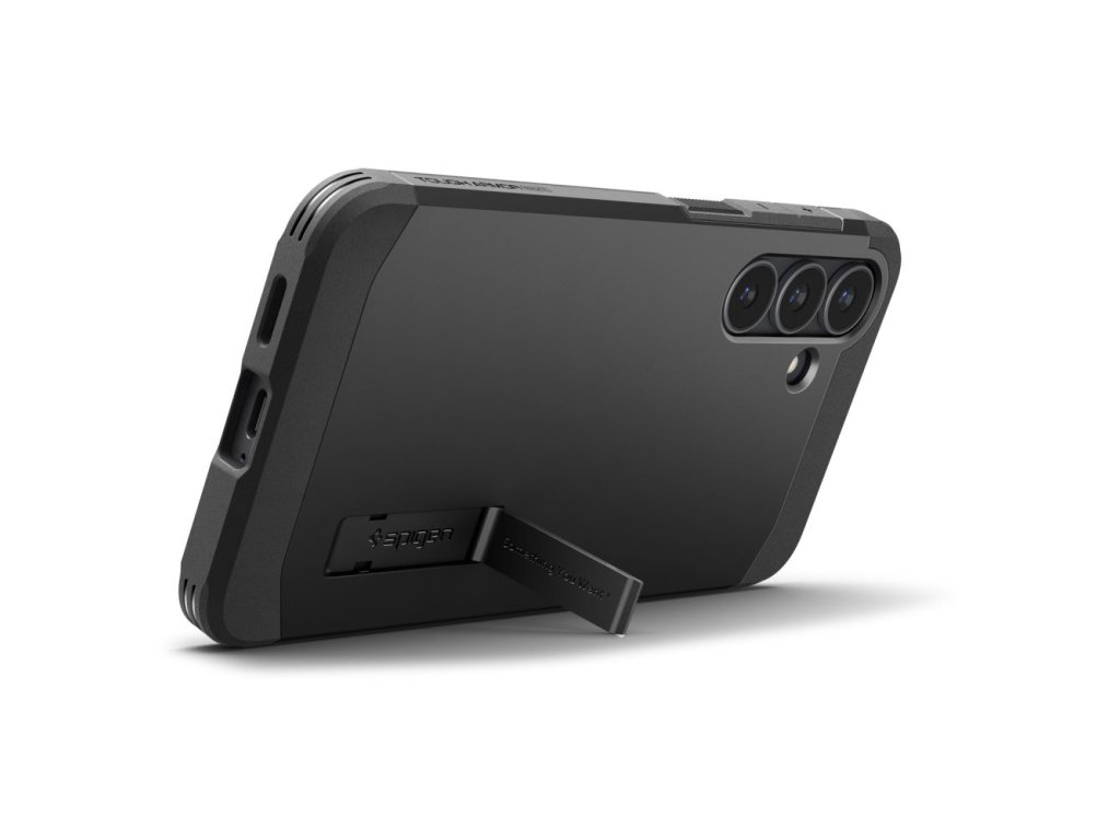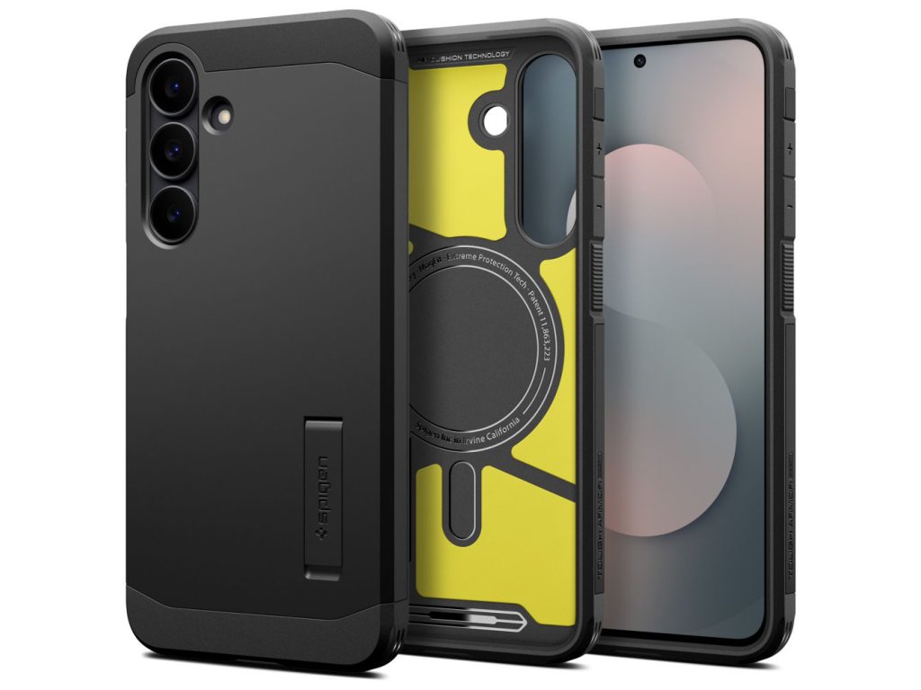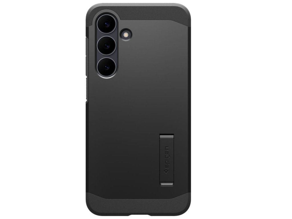 Puzdro Spigen Tough Armor pre Samsung Galaxy S25 FE, vyrobené z TPU gélu a čierneho polykarbonátu, predchádza náhodnému šmyknutiu a je odolné voči opotrebovaniu.