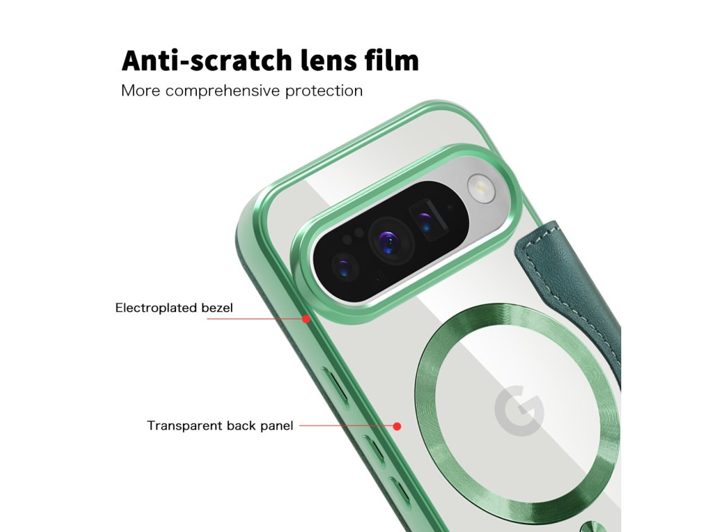 Toto je puzdro pre Google Pixel 10 Pro XL z ekologickej kože a TPU s priehľadným povrchom, prerušovaným lesklými akcentmi.