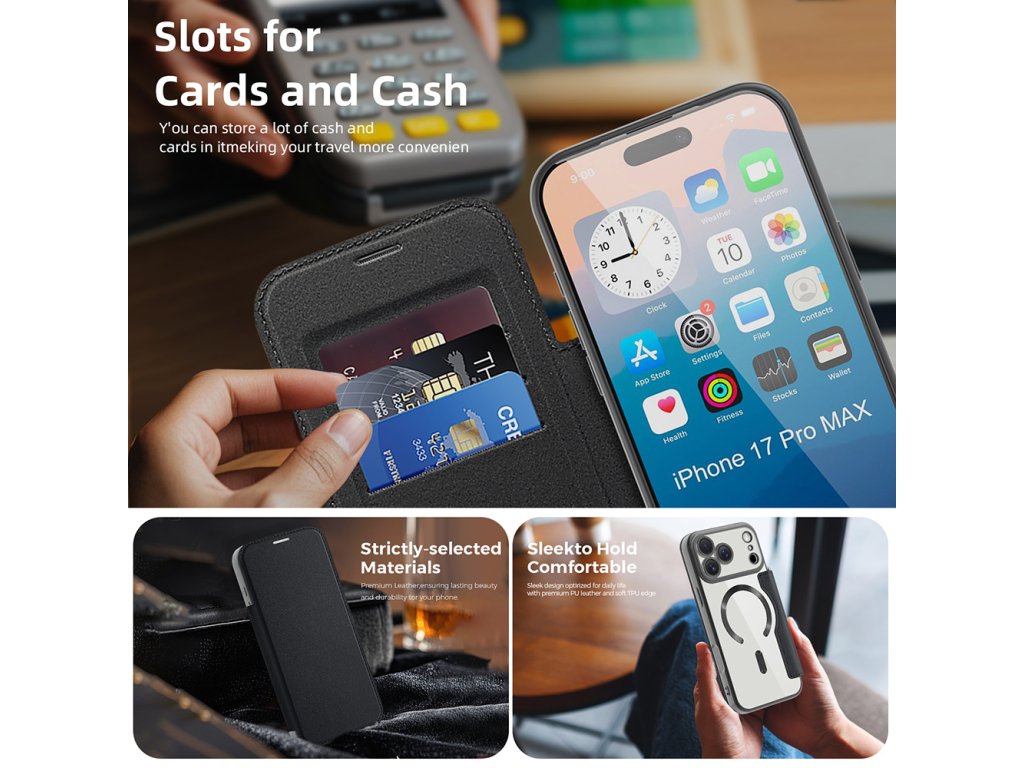 Puzdro iPhone 17 Pro Max wallet umožňuje okamžité zarovnanie s akýmkoľvek MagSafe doplnkom, bez šmýkania a bez interferencie.