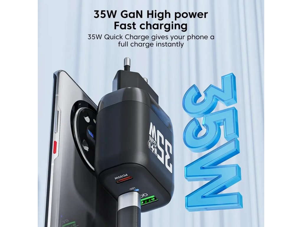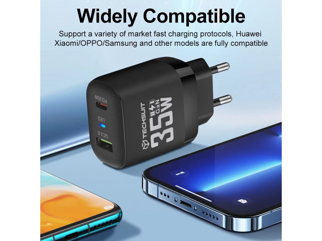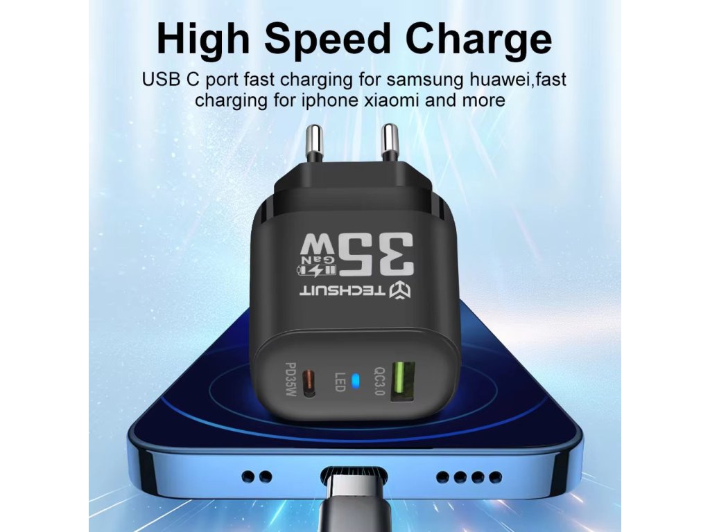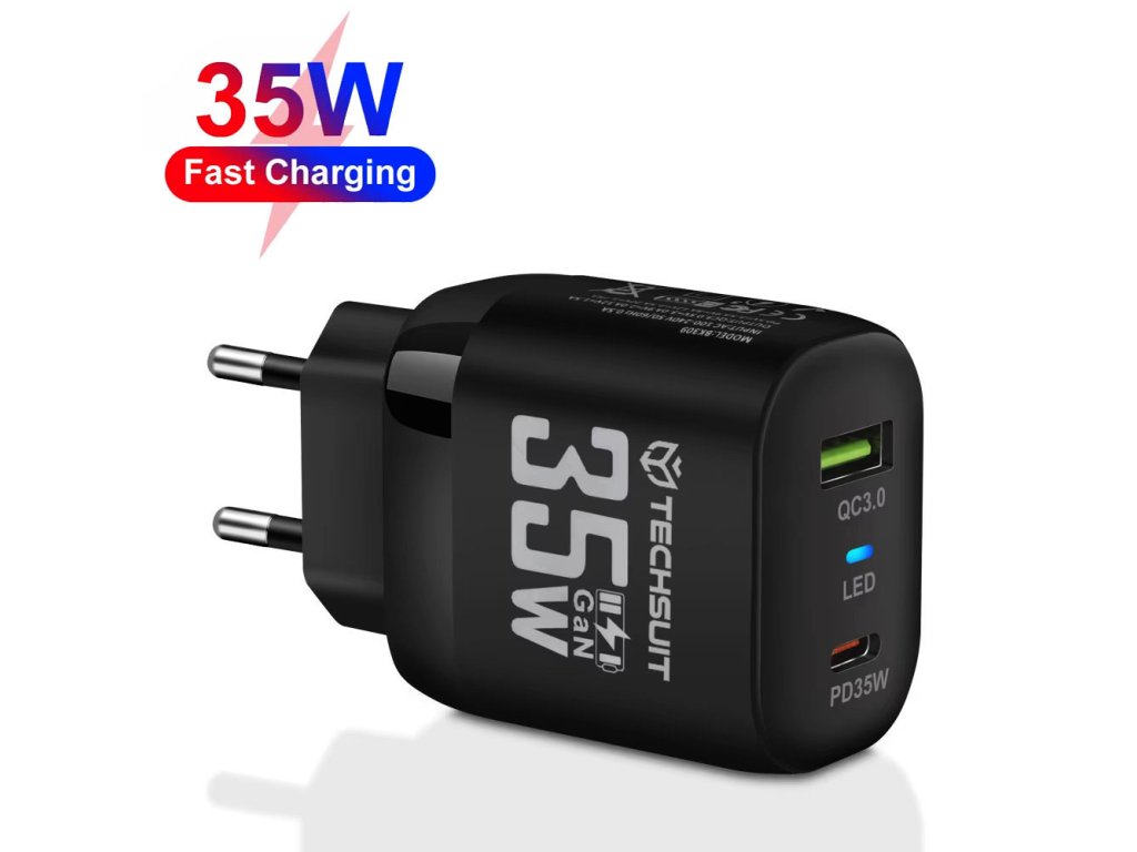 Techsuit Premium sieťová nabíjačka (CHPD174) – GaN, USB QC3.0, USB-C PD35W – čierna