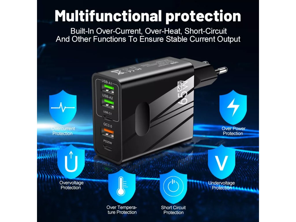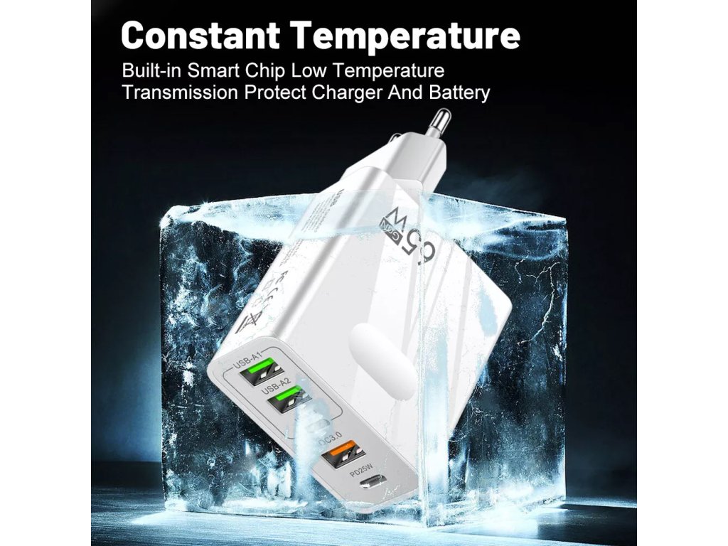 Tento multifunkčný nabíjač kombinuje štandardné USB-A porty s vysokorýchlostnými USB Type-C PD 3.0 portami.⚡Výsledok? Prémiový nabíjač s výkonom 65W.