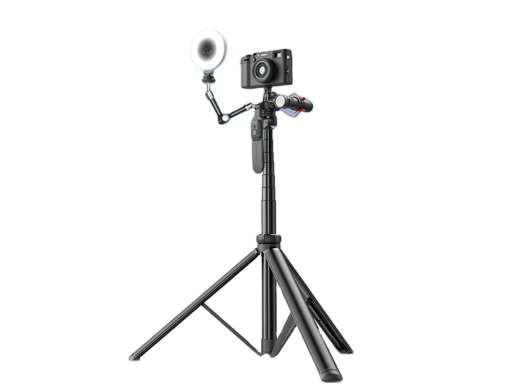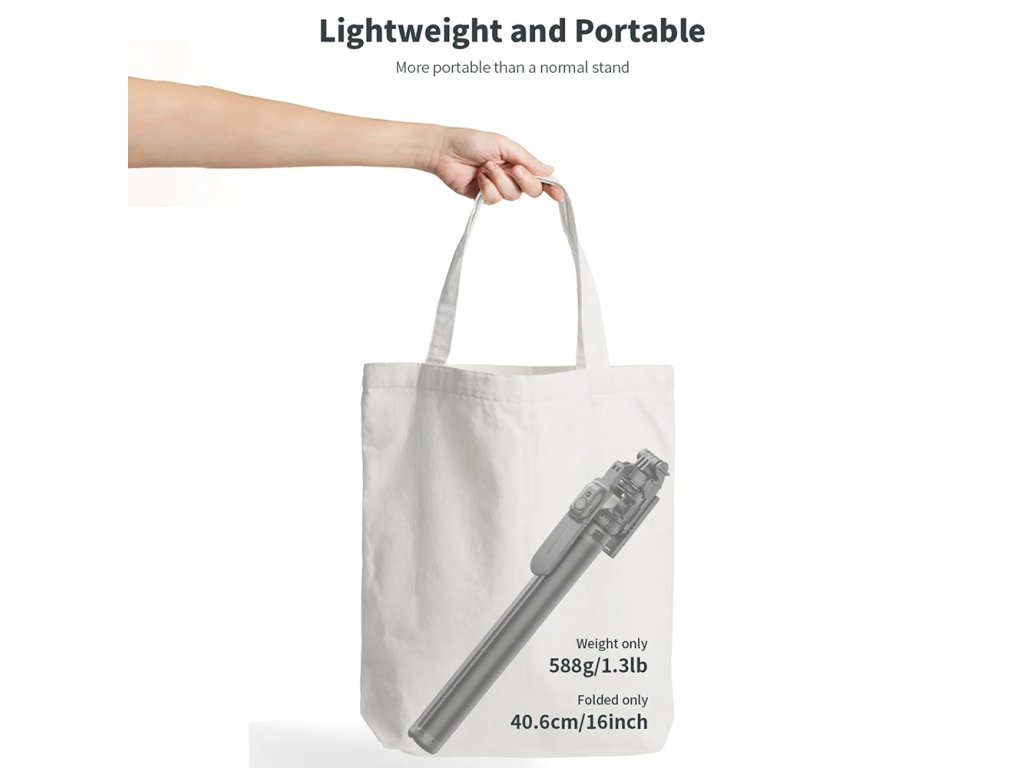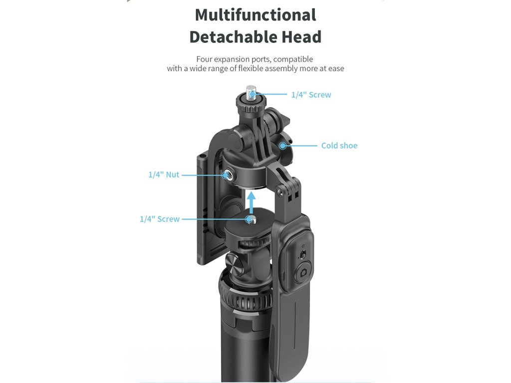 Toto je možné vďaka teleskopickému ramenu, ktoré môže dosiahnuť výšku 2 m. Bezdrôtový selfie stick je vybavený Bluetooth diaľkovým ovládaním a umožňuje sedem rôznych stupňov nastavenia. Zachyťte špeciálne chvíle s týmto telefónnym statívom, efektívnym ako dron!