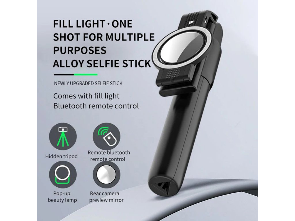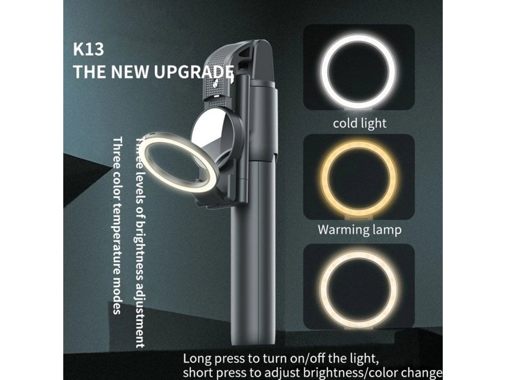 Techsuit - Selfie Stick (K13) - Compact Tripod Mount with Bluetooth Remote Control, LED Beauty Light, Foldable, 84cm - Black