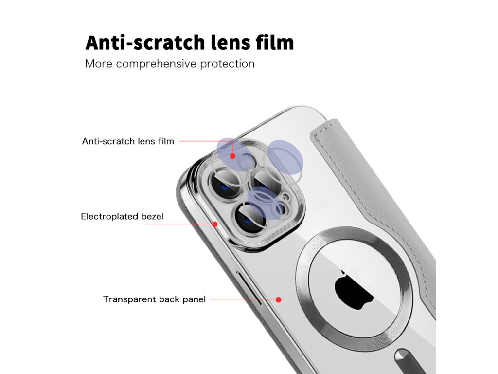 Tu je puzdro pre iPhone 11 Pro Max z ekologickej kože a TPU, ktoré má priehľadný povrch s lesklými akcentami.