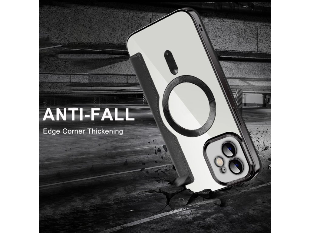 Toto je puzdro pre iPhone 12 z ekologickej kože a TPU, ktoré obsahuje priehľadný povrch, prerušený lesklými akcentmi.