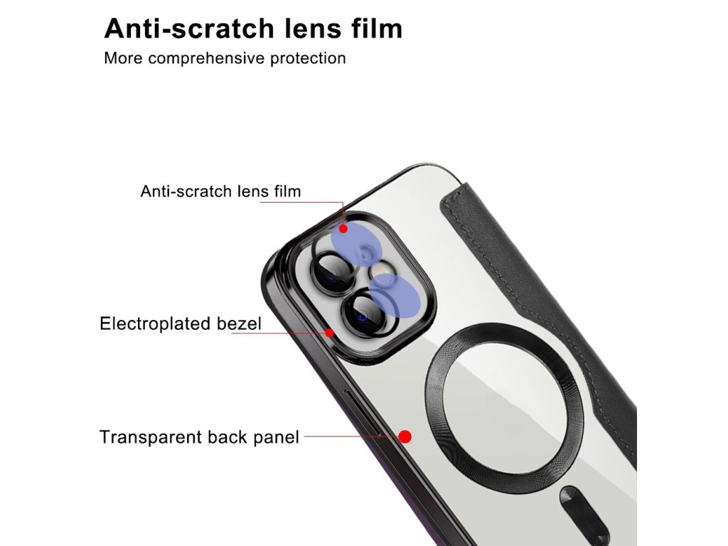 Toto je puzdro pre iPhone 12 z ekologickej kože a TPU, ktoré obsahuje priehľadný povrch, prerušený lesklými akcentmi.