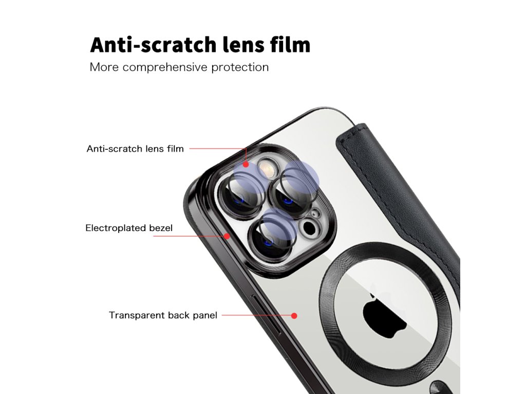 Tu je puzdro pre iPhone 13 Pro Max z ekologickej kože a TPU, ktoré má priehľadný povrch, prerušený lesklými akcentmi.
