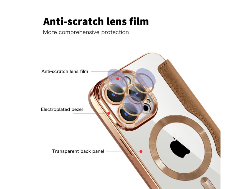 Tu je puzdro pre iPhone 15 Pro Max z ekologickej kože a TPU, ktoré má priehľadný povrch s lesklými akcentmi.