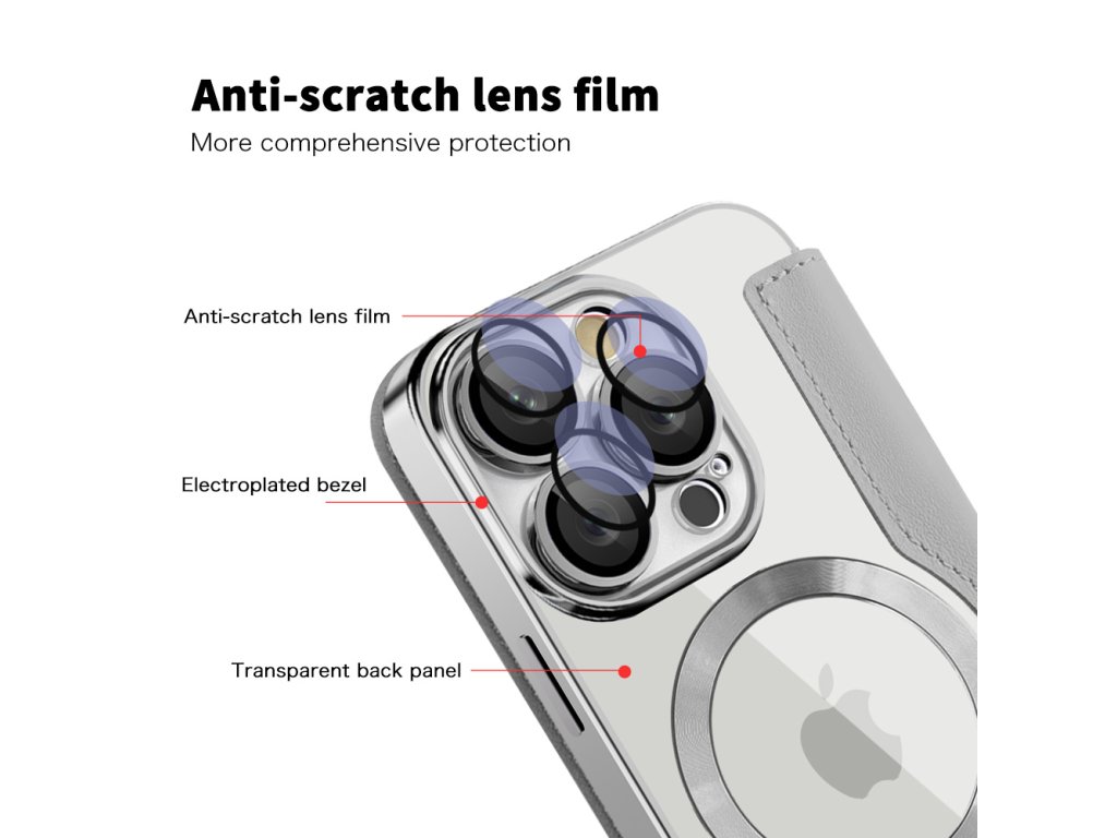 Tu je púzdro pre iPhone 16 Pro Max z ekologickej kože a TPU s priehľadným povrchom, prerušené lesklými akcentmi.