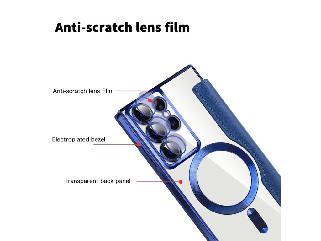 Tu je obal pre Samsung Galaxy S22 Ultra 5G z ekologickej kože a TPU, ktorý má priehľadný povrch, prerušený lesklými akcentmi.