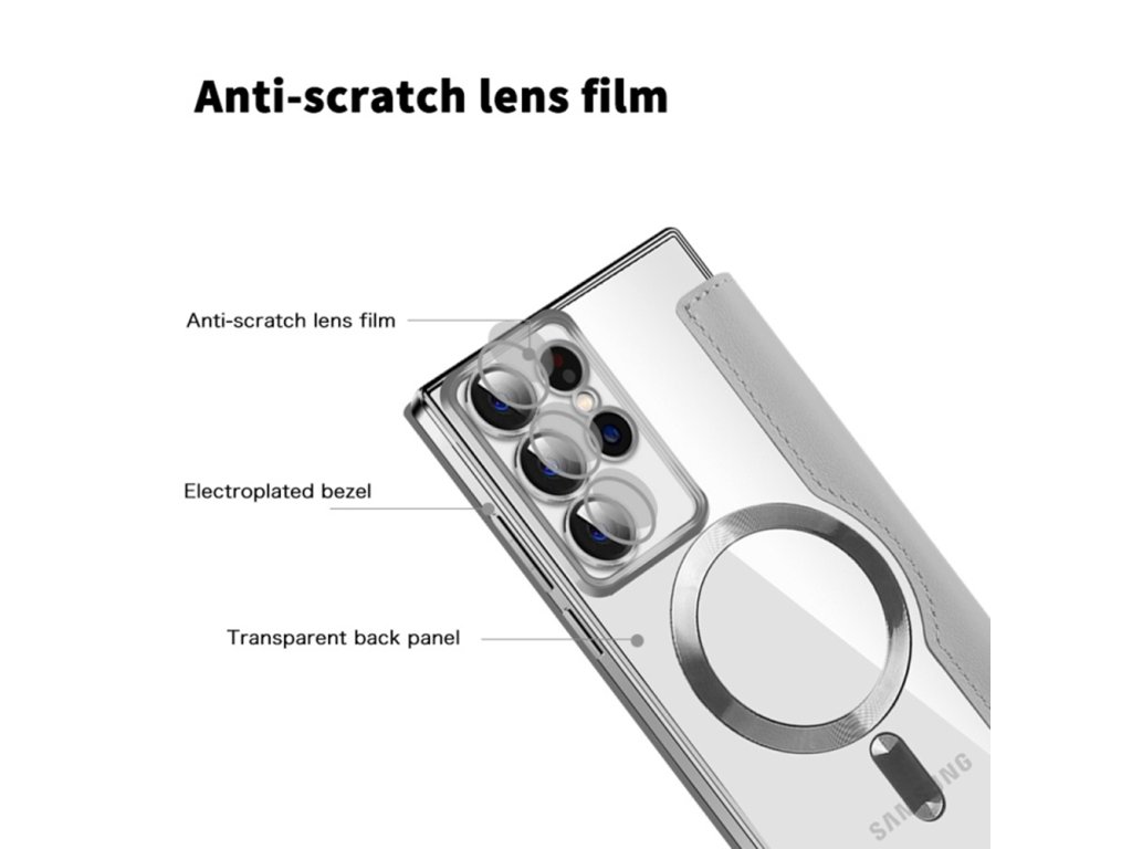 Tu je obal pre Samsung Galaxy S22 Ultra 5G z ekologickej kože a TPU, ktorý má priehľadný povrch, prerušený lesklými akcentmi.