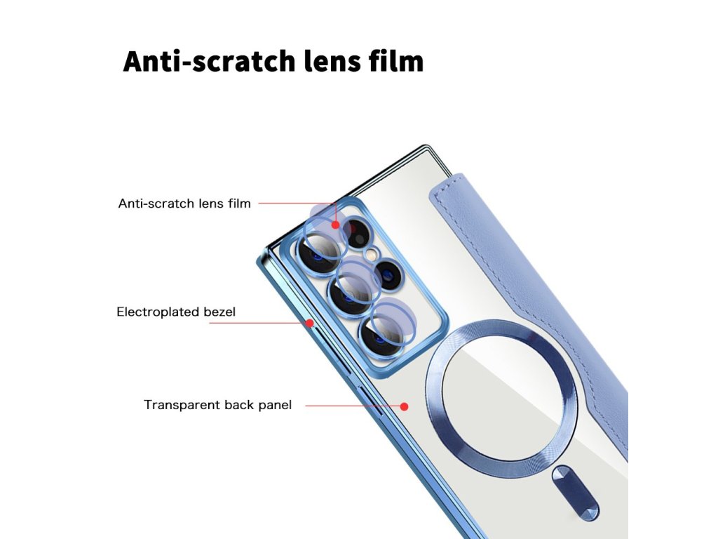 Tu je obal pre Samsung Galaxy S22 Ultra 5G z ekologickej kože a TPU, ktorý má priehľadný povrch, prerušený lesklými akcentmi.