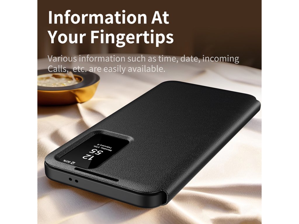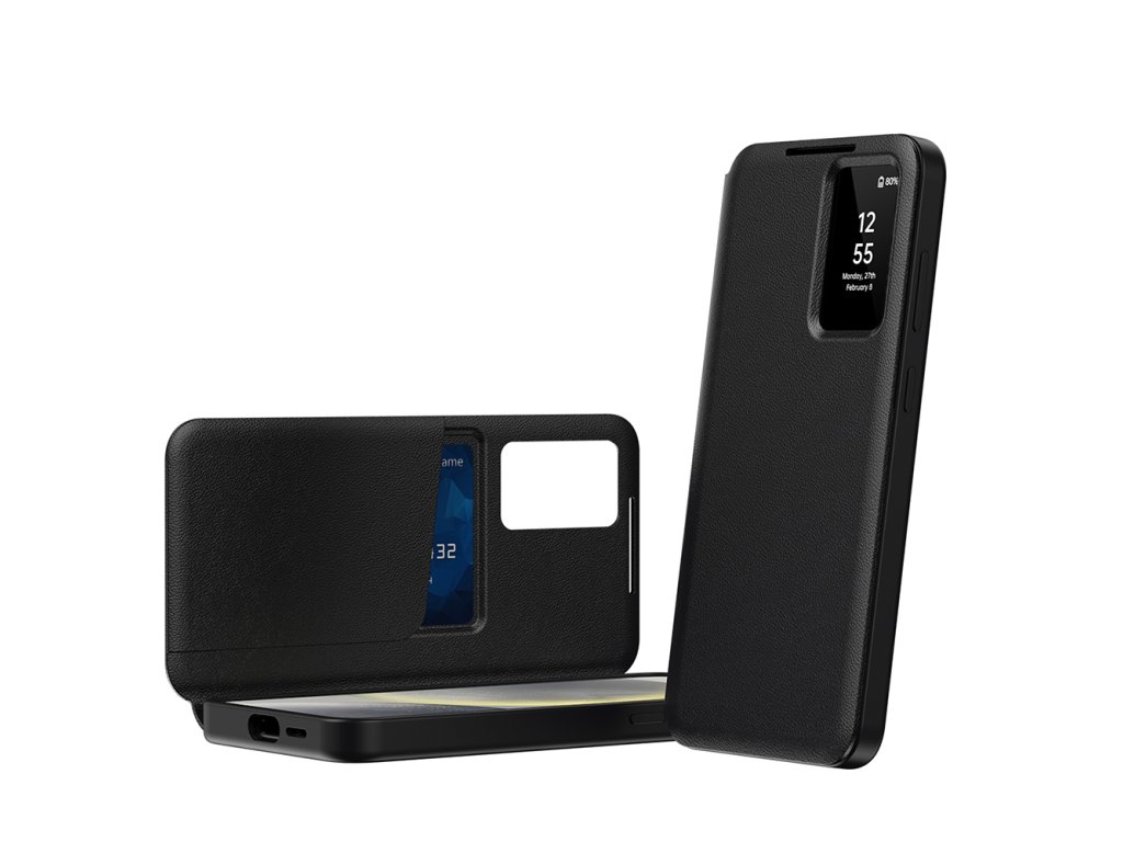 Puzdro Samsung Galaxy S25 Plus s úplným krytom ponúka inteligentný rám, cez ktorý môžete kedykoľvek zobraziť čas a oznámenia.
