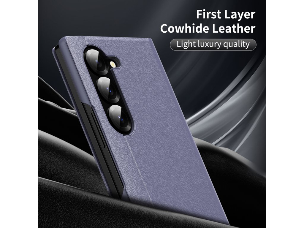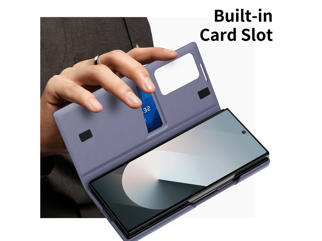 Puzdro Samsung Galaxy Z Fold6, vyrobené z ekologickej kože, obklopuje telefón jemnou textúrou, ktorá nielen vyzerá, ale aj pôsobí prémiovo.