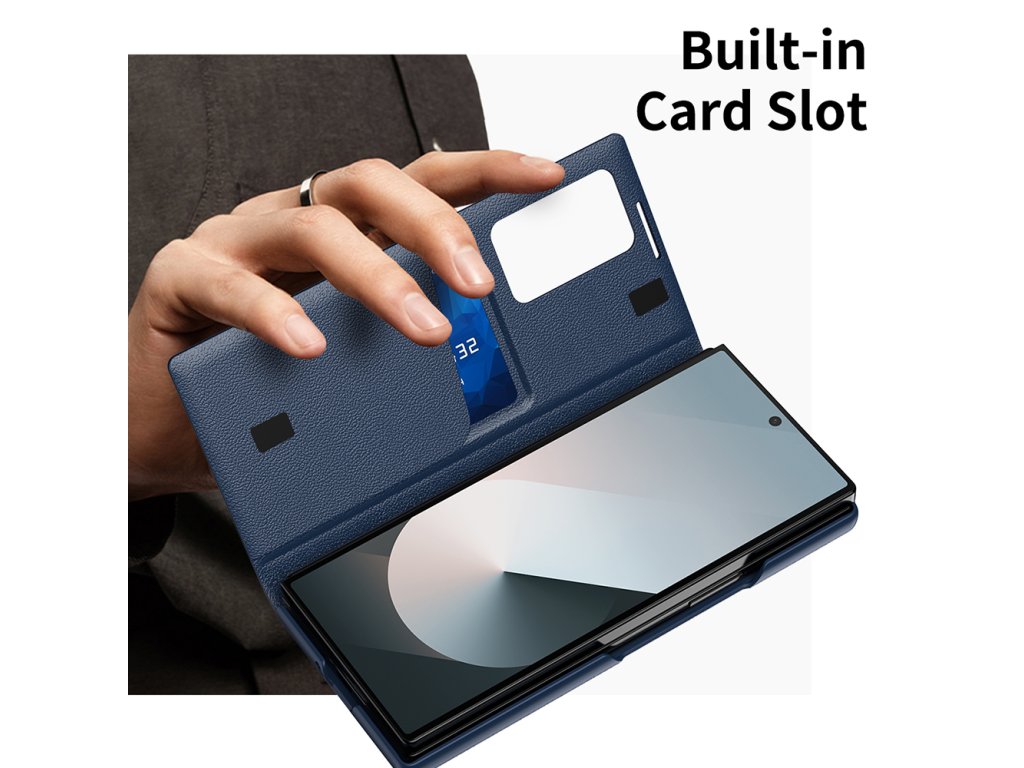 Puzdro Samsung Galaxy Z Fold6, vyrobené z ekologickej kože, obklopuje telefón jemnou textúrou, ktorá nielen vyzerá, ale aj pôsobí prémiovo.