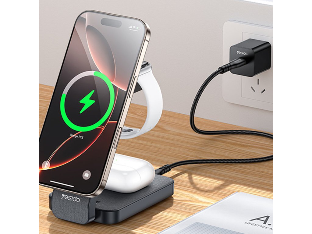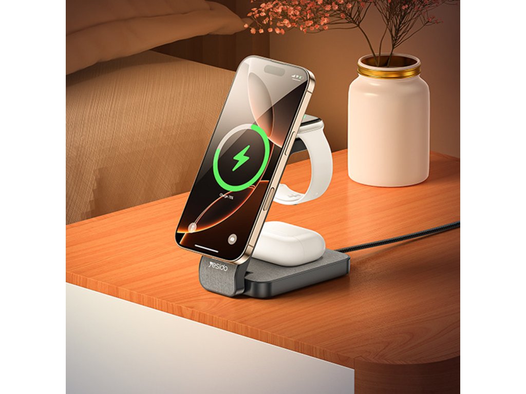 Nabíjacia stanica Yesido umožňuje súčasné nabíjanie telefónu, inteligentných hodiniek a bezdrôtových slúchadiel, čím je ideálnym riešením pre akékoľvek nastavenie.